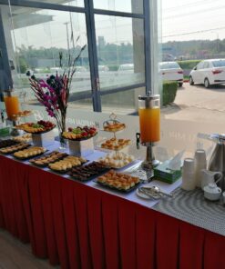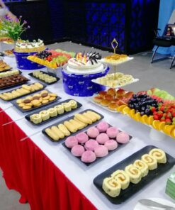 | Báo giá tiệc ngọt – Set menu 90.000/phần ( chưa bao gồm 8% VAT) Gồm 5 loại bánh ( 3 bánh ngọt + 2 bánh mặn HOẶC 3 bánh mặn + 2 bánh ngọt) Trái cây 4 loại Nước uống 3 loại Trang thiết bị dùng tiệc Bàn tiệc có khủ khăn đẹp mắt. Nhân sự phục vụ ( tối đa 3h đồng hồ) Vận chuyển ( cách đơn vị 5km) Áp dụng cho số lượng > 70 phần | MENU MẪU 1.Bánh su kem ( bánh ngọt) 2. Yogurt tart ( bánh ngọt) 3.Jambon cuốn chà bông sốt bơ ( bánh mặn) 4.Bánh pateso ( bánh mặn) 5.Bánh bông lan chà bông trứng muối ( bánh mặn) 6. Trái cây: dưa hấu, ổi, cam úc, nho mĩ. 7.Nước uống: Cà phê + sữa đặc, trà lipton, nước trái cây. Dùng ly giấy, đĩa sứ,muỗng nĩa inox, hoa và kệ trang trí cơ bản |