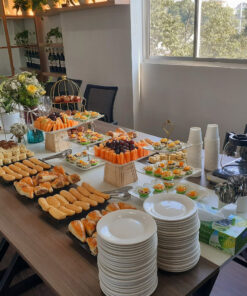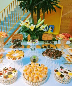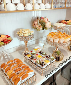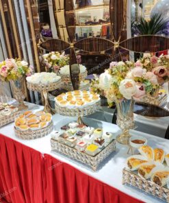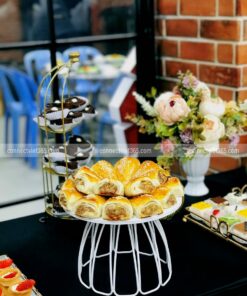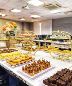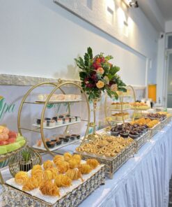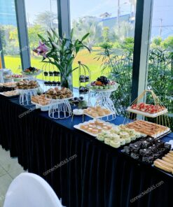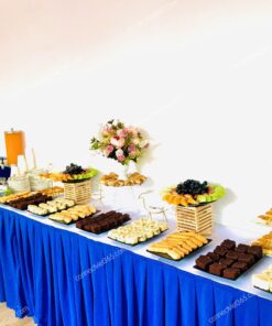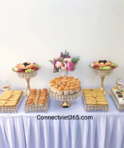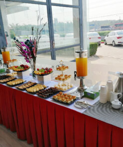| Dịch vụ teabreak khai trương giá rẻ – Set menu 90.000/phần ( chưa bao gồm 8% VAT) Gồm 5 loại bánh ( 3 bánh ngọt + 2 bánh mặn HOẶC 3 bánh mặn + 2 bánh ngọt) Trái cây 4 loại Nước uống 3 loại Trang thiết bị dùng tiệc Bàn tiệc có khủ khăn đẹp mắt. Nhân sự phục vụ ( tối đa 3h đồng hồ) Vận chuyển ( cách đơn vị 5km) Áp dụng cho số lượng > 50 phần | MENU MẪU 1.Bánh su kem ( bánh ngọt) 2. Yogurt tart ( bánh ngọt) 3.Jambon cuốn chà bông sốt bơ ( bánh mặn) 4.Bánh pateso ( bánh mặn) 5.Bánh bông lan chà bông trứng muối ( bánh mặn) 6. Trái cây: dưa hấu, ổi, cam úc, nho mĩ. 7.Nước uống: Cà phê + sữa đặc, trà lipton, nước trái cây. Dùng ly giấy, đĩa sứ,muỗng nĩa inox, hoa và kệ trang trí cơ bản |