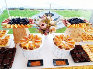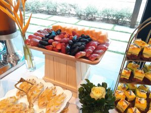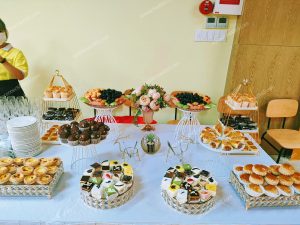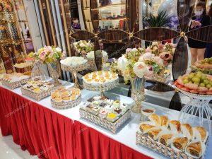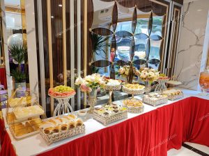 | Dịch vụ teabreak giá rẻ – Set menu 90.000/phần ( chưa bao gồm 8% VAT) Gồm 5 loại bánh ( 3 bánh ngọt + 2 bánh mặn HOẶC 3 bánh mặn + 2 bánh ngọt) Trái cây 4 loại Nước uống 3 loại Trang thiết bị dùng tiệc Bàn tiệc có khủ khăn đẹp mắt. Nhân sự phục vụ ( tối đa 3h đồng hồ) Vận chuyển ( cách đơn vị 5km) Áp dụng cho số lượng > 50 phần | MENU MẪU 1.Bánh su kem ( bánh ngọt) 2. Yogurt tart ( bánh ngọt) 3.Jambon cuốn chà bông sốt bơ ( bánh mặn) 4.Bánh pateso ( bánh mặn) 5.Bánh bông lan chà bông trứng muối ( bánh mặn) 6. Trái cây: dưa hấu, ổi, cam úc, nho mĩ. 7.Nước uống: Cà phê + sữa đặc, trà lipton, nước trái cây. Dùng ly giấy, đĩa sứ,muỗng nĩa inox, hoa và kệ trang trí cơ bản |